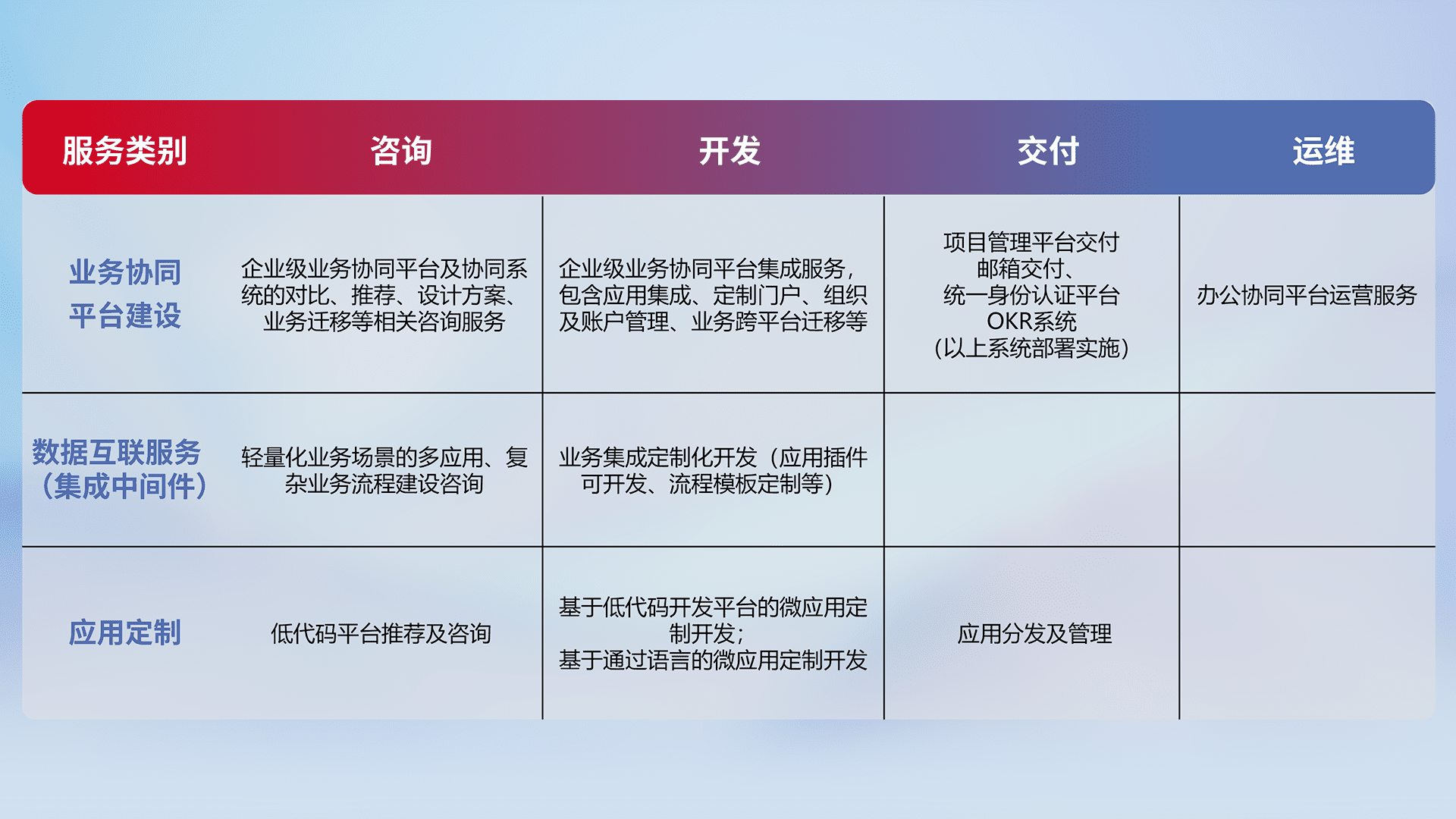 针对钉钉、、、企微、、、IDaas等平台级产品提供产品的规划、、、方案、、、交付、、定制化开发等服务,,实现如统一协同办公、、智能客户服务、、、、混合会议管理、、智能数据查询、、等业务场景,,,实现数字化转型。。。。
